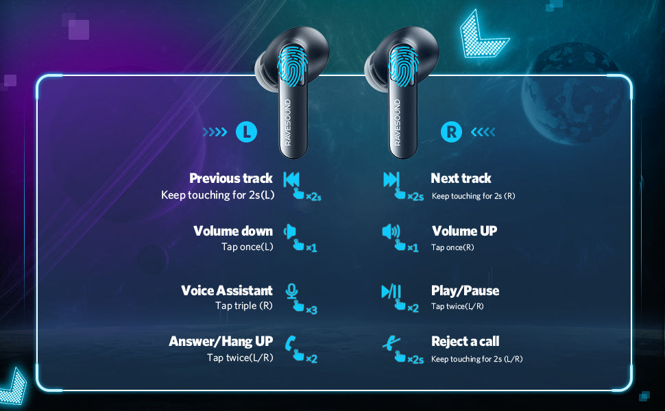 Say goodbye to buttons! Ravesound wireless earbuds feature a capacitive touch interface. On the both earbud, you can play or pause music and to answer calls — No more fumbling for your phone to change a song.